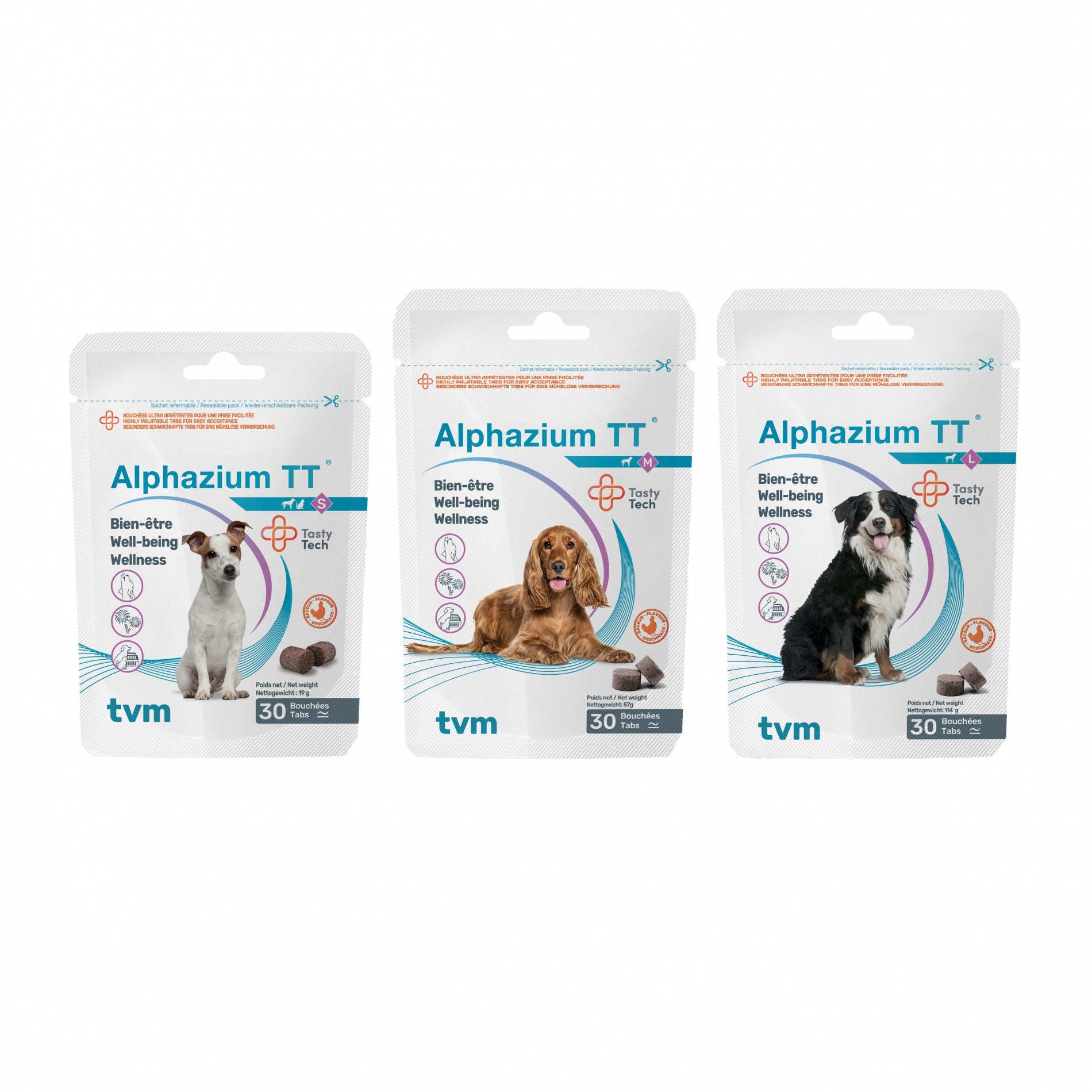 Alphazium TT s'utilise en cure d'un mois ou ponctuellement (1 à 3 jours avant l’événement stressant, pendant celui-ci et quelques jours après). Il est disponible en 3 formats (S, M, L) pour s'adapter à toutes les tailles de chien. Voir l'onglet mode d'emploi.