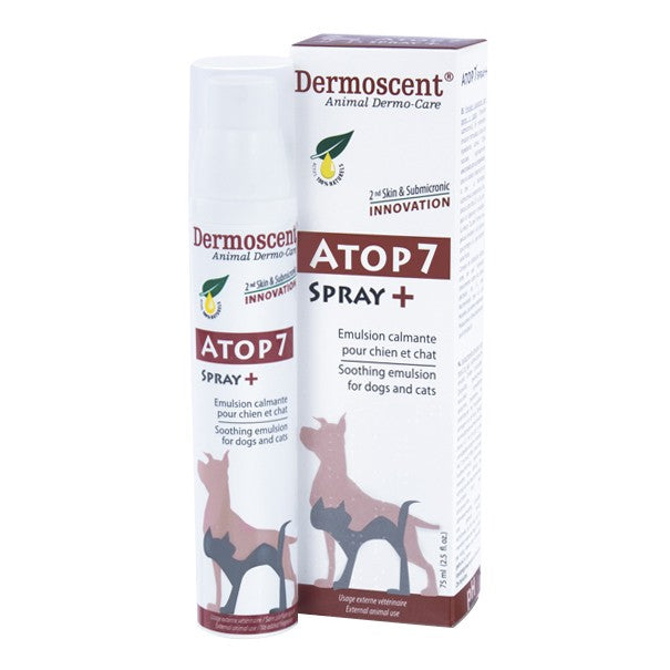 Atop 7 Spray est une émulsion calmante et hydratante enrichie en actifs naturels et sans corticoïde pour les peaux prurigineuses, irritées ou à tendance allergique des chiens et des chats.