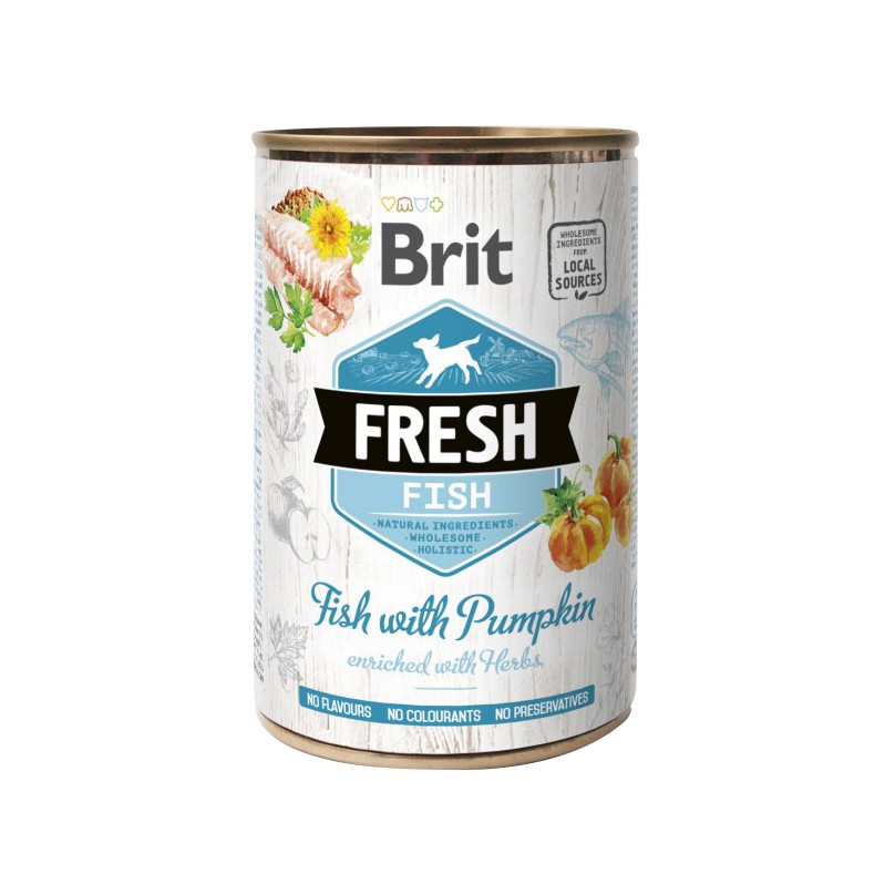 Brit Fresh Poisson & Citrouille est un aliment complet sous forme de pâtée en boîte pour chien adulte dès 1 an, quelle que soit sa taille.