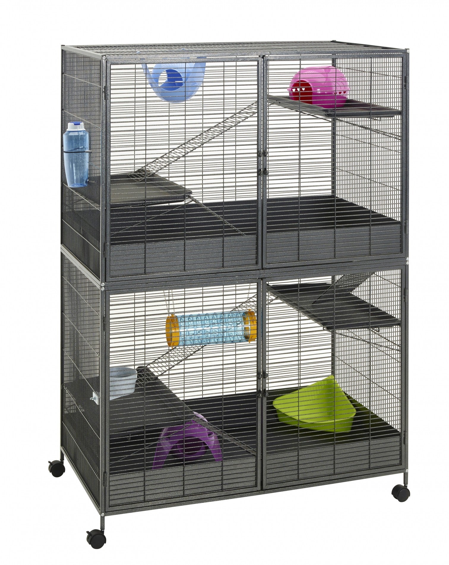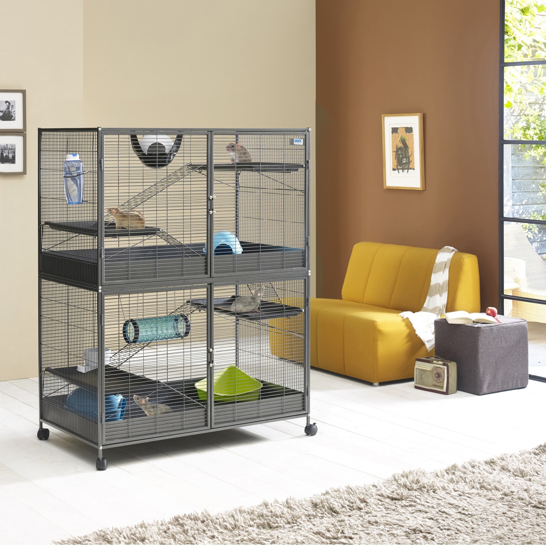 Cette belle cage très spacieuse et luxueuse est un lieu idéal de vie pour furet, rat, chinchilla ou écureuil. Constituée de 2 niveaux séparables facilement, tout est prévu pour accueillir un ou plusieurs animaux dans un espace très agréable, de qualité et facilement modulable :