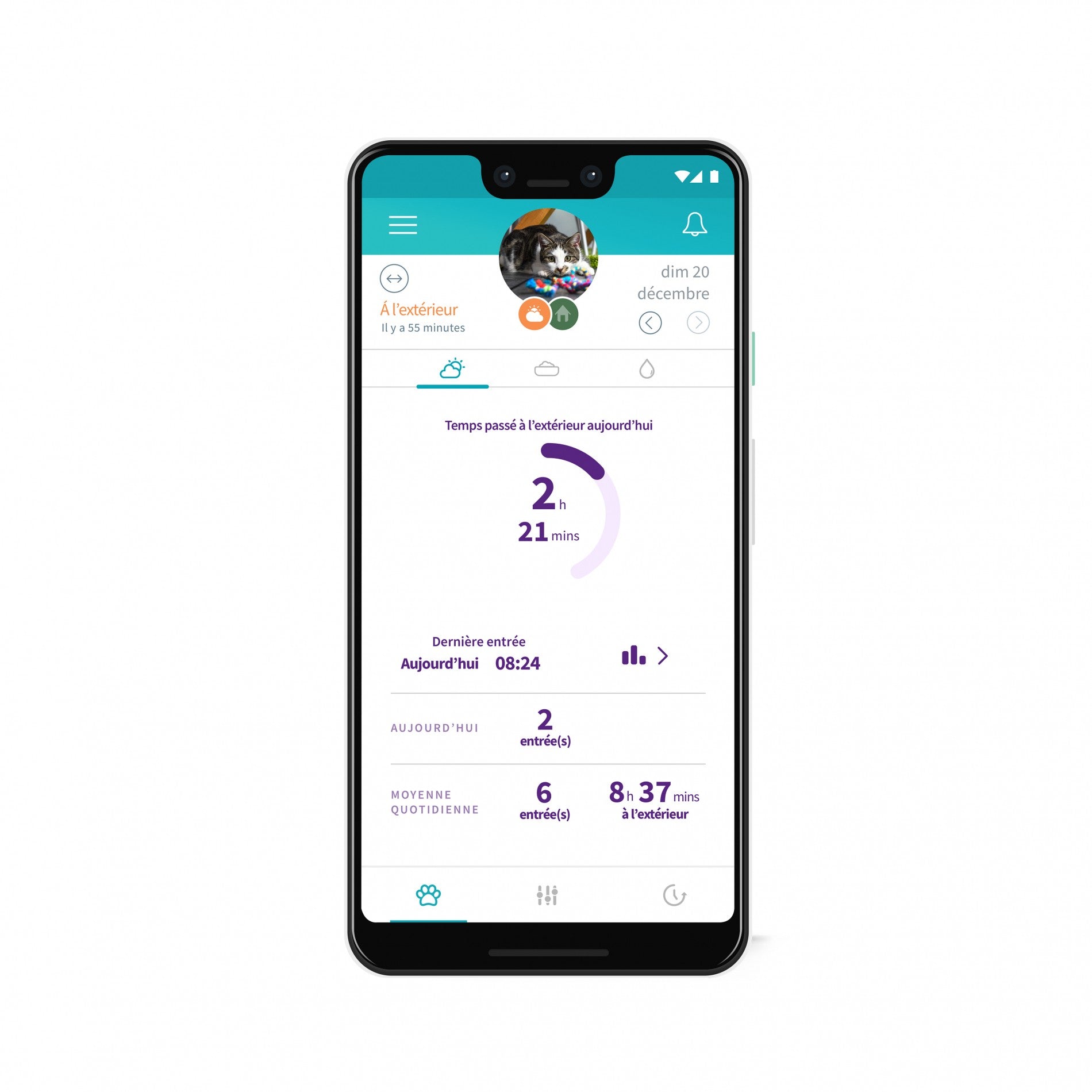 Vous pouvez visualiser et contrôler les entrées et sorties de votre petit félin, même à distance, depuis votre téléphone, en créant son profil sur l’application dédiée. Vous pouvez également personnaliser les options de verrouillage de chacun de vos animaux. Un Hub de connexion est indispensable pour faire le lien entre la chatière et l'application.