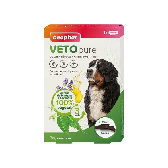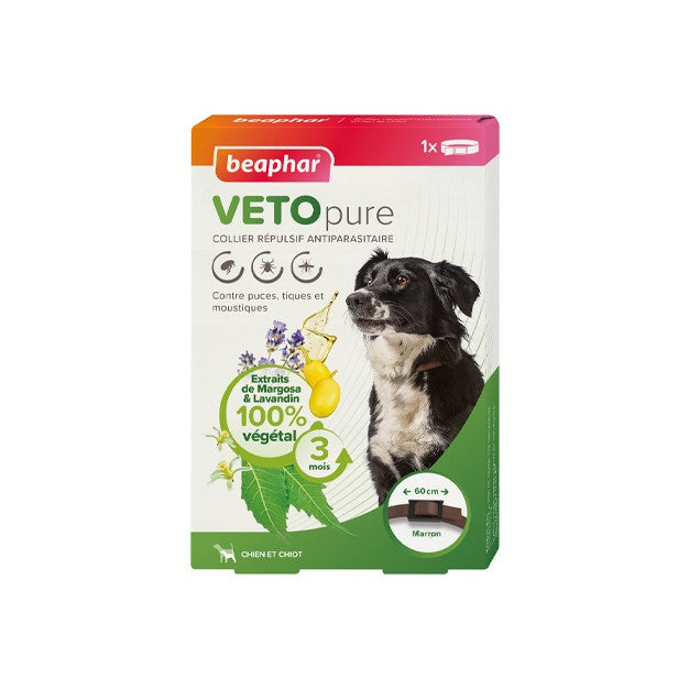 Le collier répulsif antiparasitaire Vetopure Beaphar est spécialement conçu pour repousser les parasites externes : puces, tiques et moustiques. Ce collier existe en deux tailles (chien et chiot ou grand chien) et en plusieurs couleurs. Il peut être utilisé chez les chiots de plus de 3 mois.