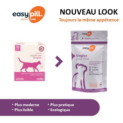 Le packaging de la gamme EASYPILL évolue en passant d’un format boite à un format sachet refermable. La transition vers les nouveaux emballages est en cours.