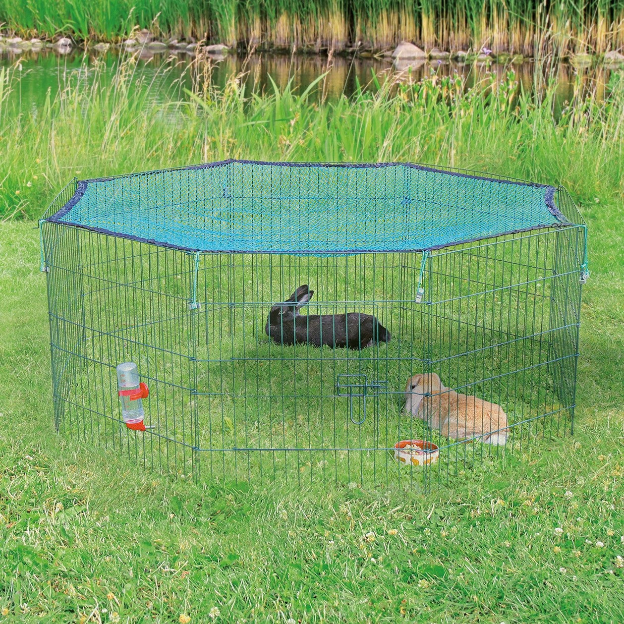 Il dispose de 8 panneaux de 60 x 57 cm et d'un portillon avec loquet de fermeture. Il est livré avec un filet de protection pour empêcher votre petit animal de s'échapper et de le protéger des agressions d'oiseaux et de chats extérieurs.