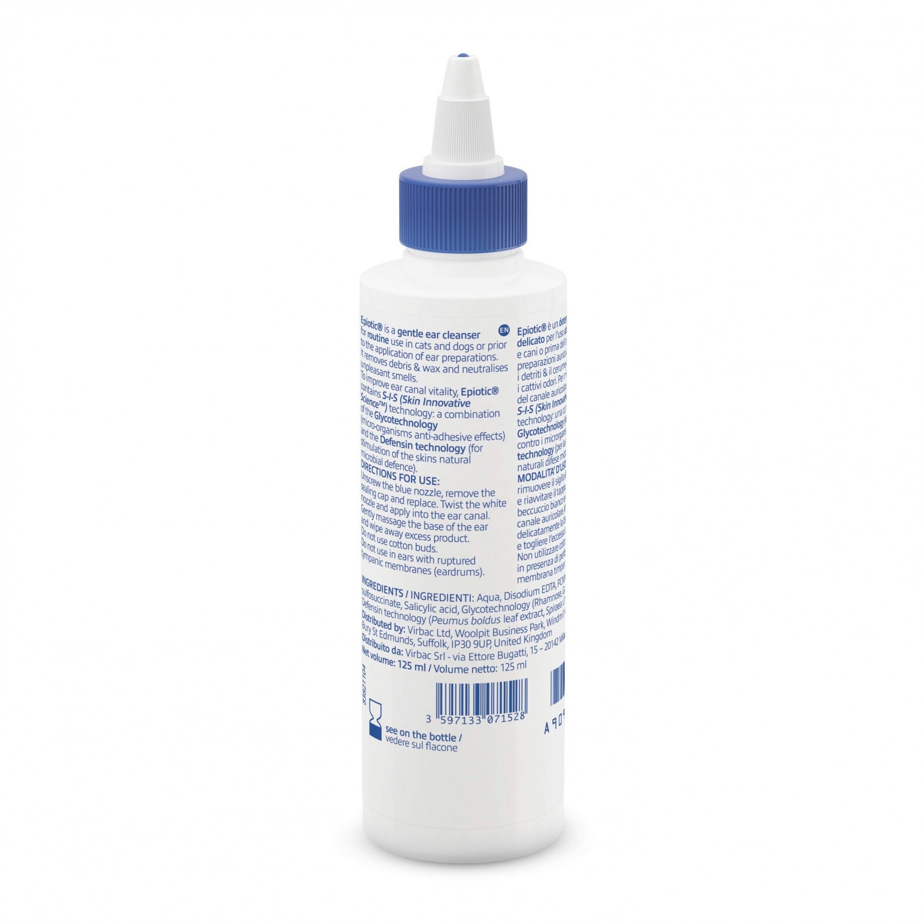 Epi-Otic est un nettoyant non irritant aux propriétés antiseptiques de surface. Il contient des substances qui assèchent le conduit auditif et forment un film protecteur à la surface de la peau et des poils. Sa nouvelle formule contient un complexe anti-adhésif qui permet une meilleure lutte contre les proliférations bactériennes lors d'otites.