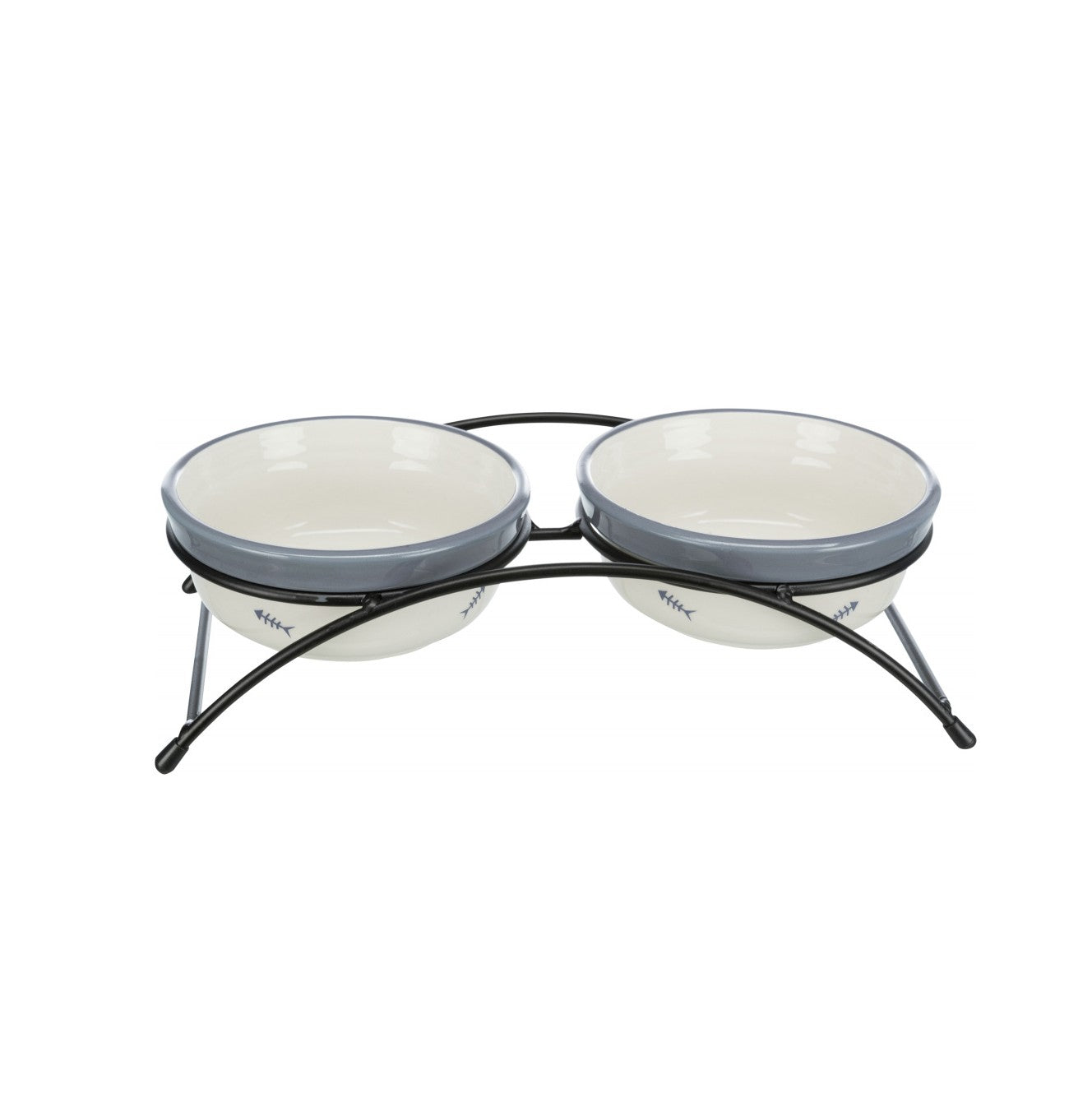 Ces gamelles pour chat en céramique sont présentées sur un support double pour pouvoir proposer en même temps à votre animal des croquettes et de l'eau.