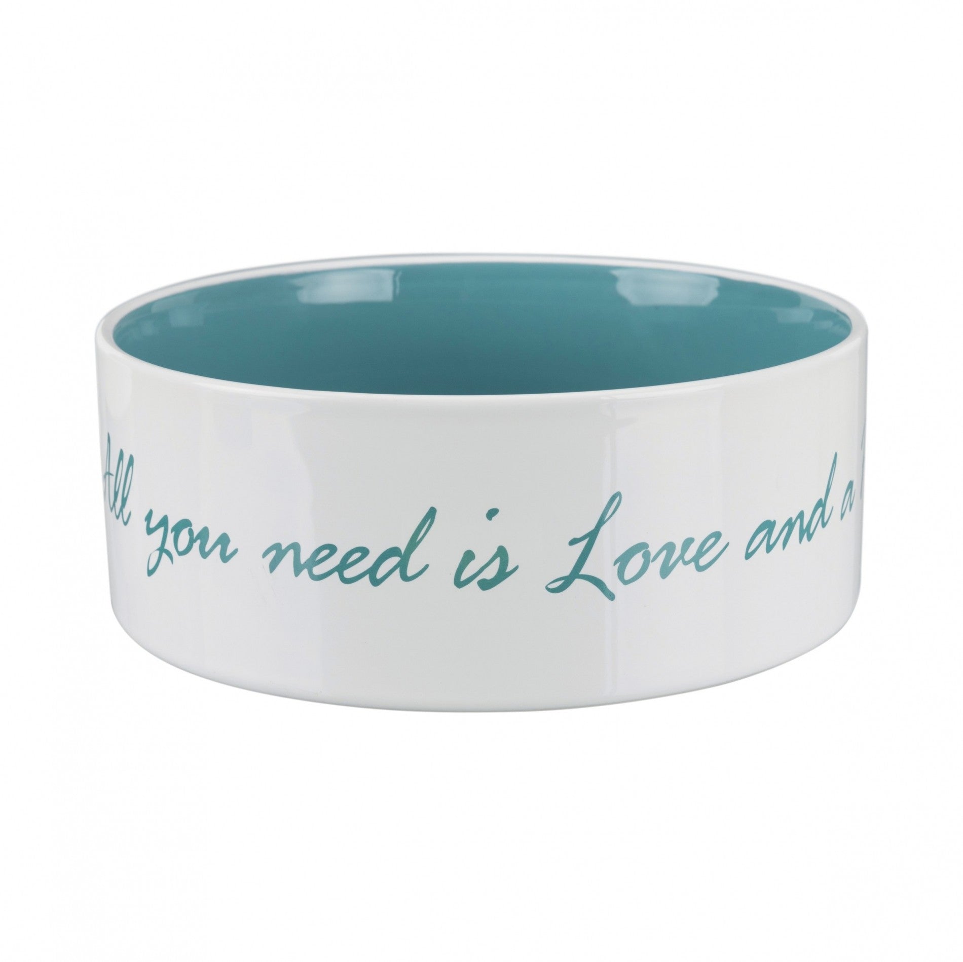 L’inscription « All you need is love and a pet » (traduction : tout ce dont on a besoin c'est de l'amour et un animal de compagnie) tout autour de la gamelle fait référence à la chanson mondialement connue de John Lennon "All you need is love". Une petite note musicale pendant le moment du repas !