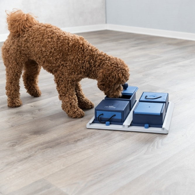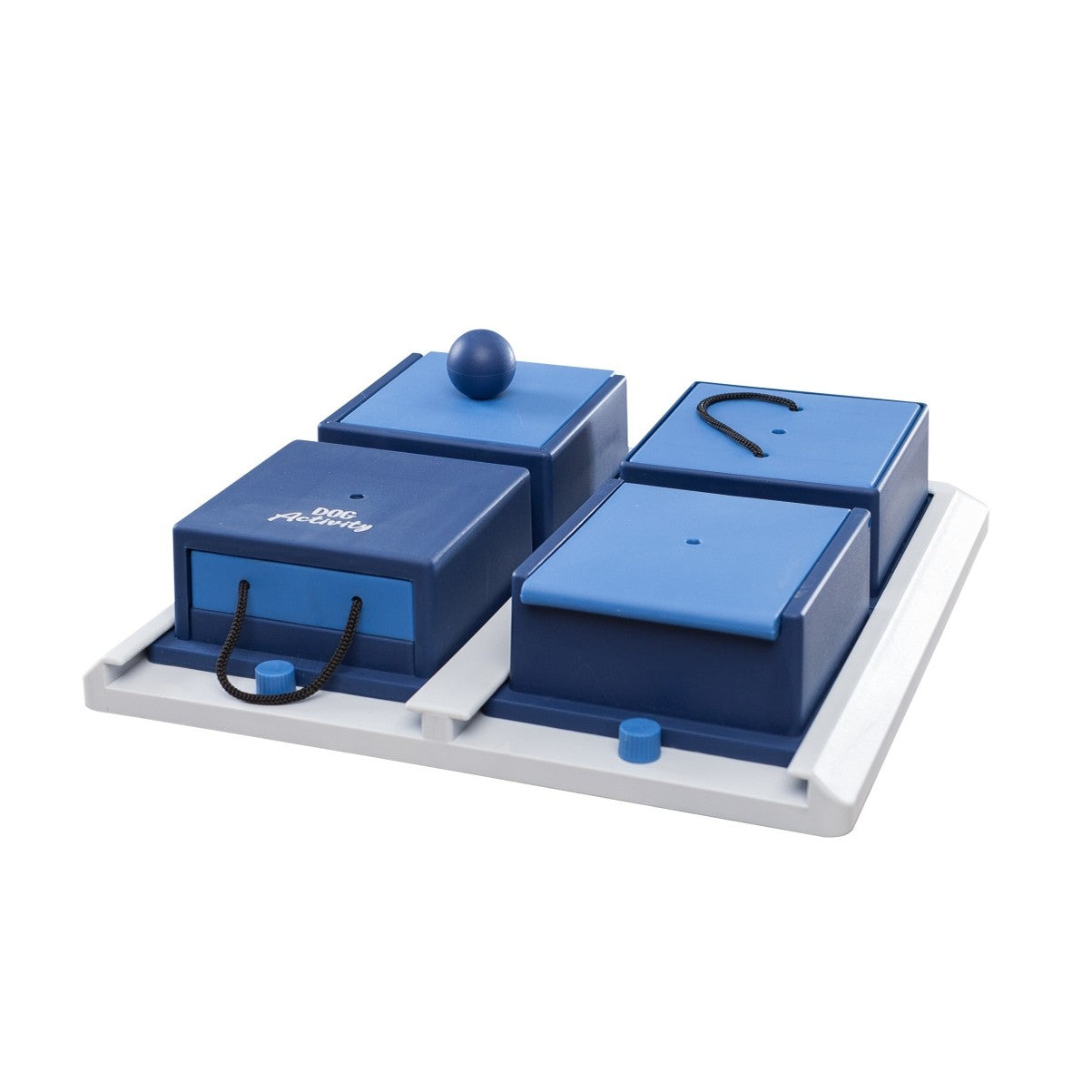 Le jeu Poker Box est une boîte à 4 compartiments. Dans chaque compartiment, vous pourrez cacher des friandises que votre chien devra trouver. Avec un peu d'exercice, votre chien sera en mesure d'ouvrir les différents compartiments. Ce jeu éducatif pour chien est idéal pour les chiens de tout âge.