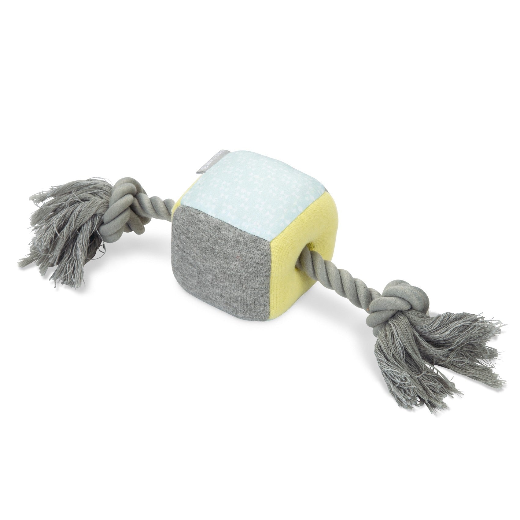 Il est composé d’un cube en peluche multicolore traversé par une corde, assez robuste pour résister à ses petits crocs aiguisés tout en restant très douce et facile à mâchouiller. Un jeu de texture qui lui permet de développer son sens du toucher !