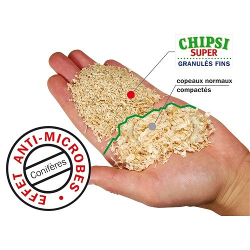CHIPSI SUPER est une litière pour rongeur et furet entièrement naturelle et composée de granulés de bois tendre :