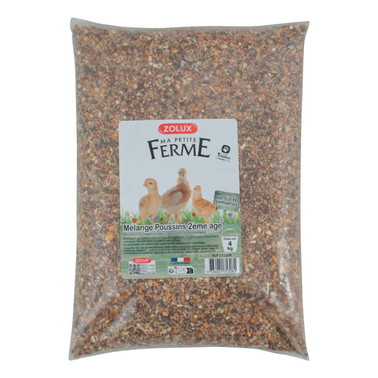 Le mélange poussin 2ème âge Zoluz est adapté aux poussins de 5 à 16 semaines.