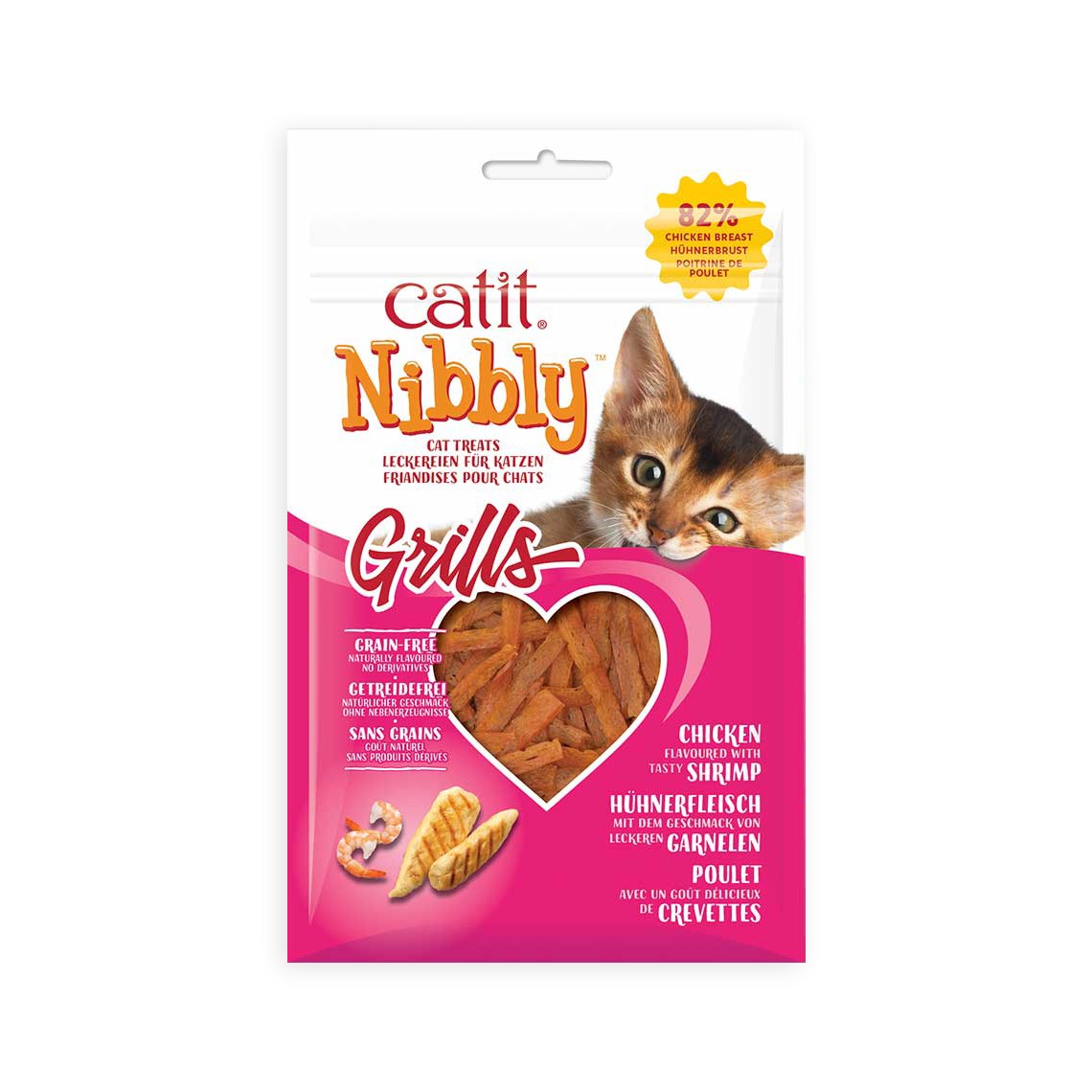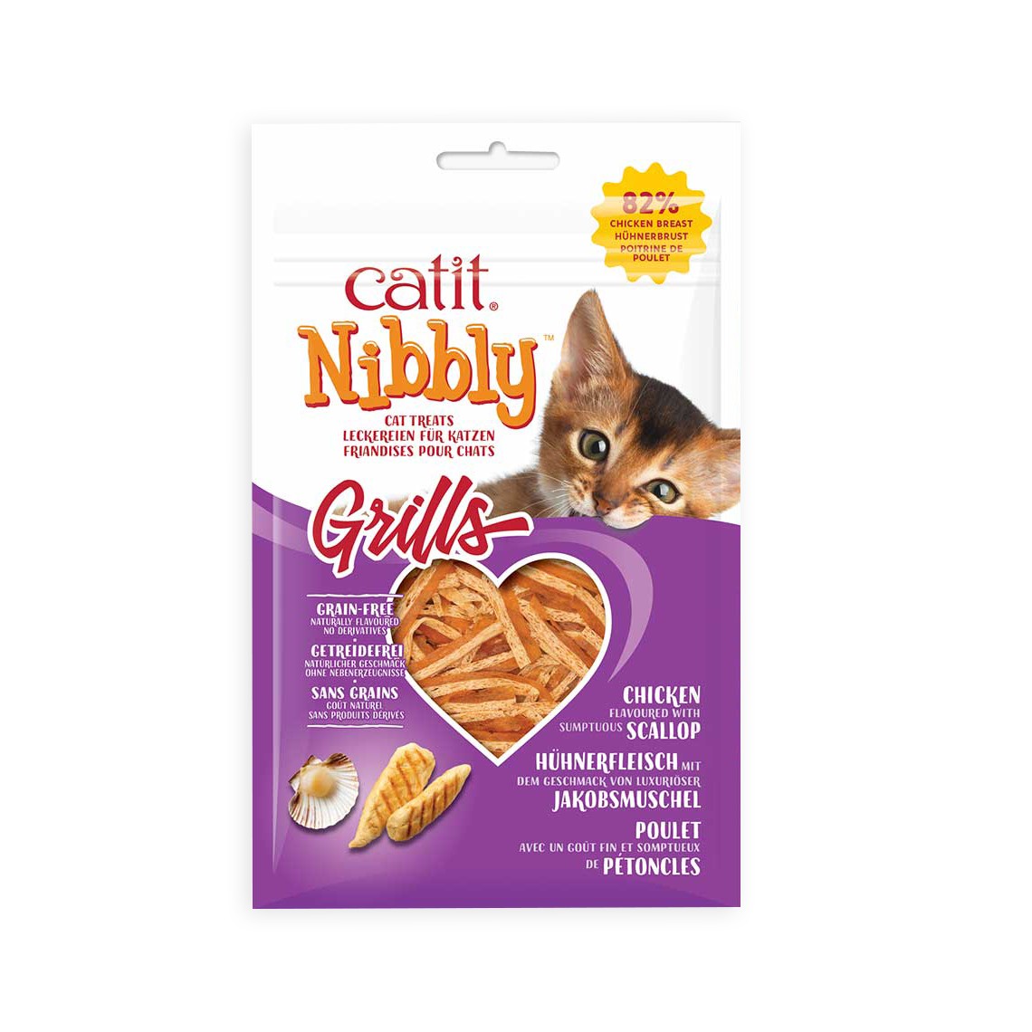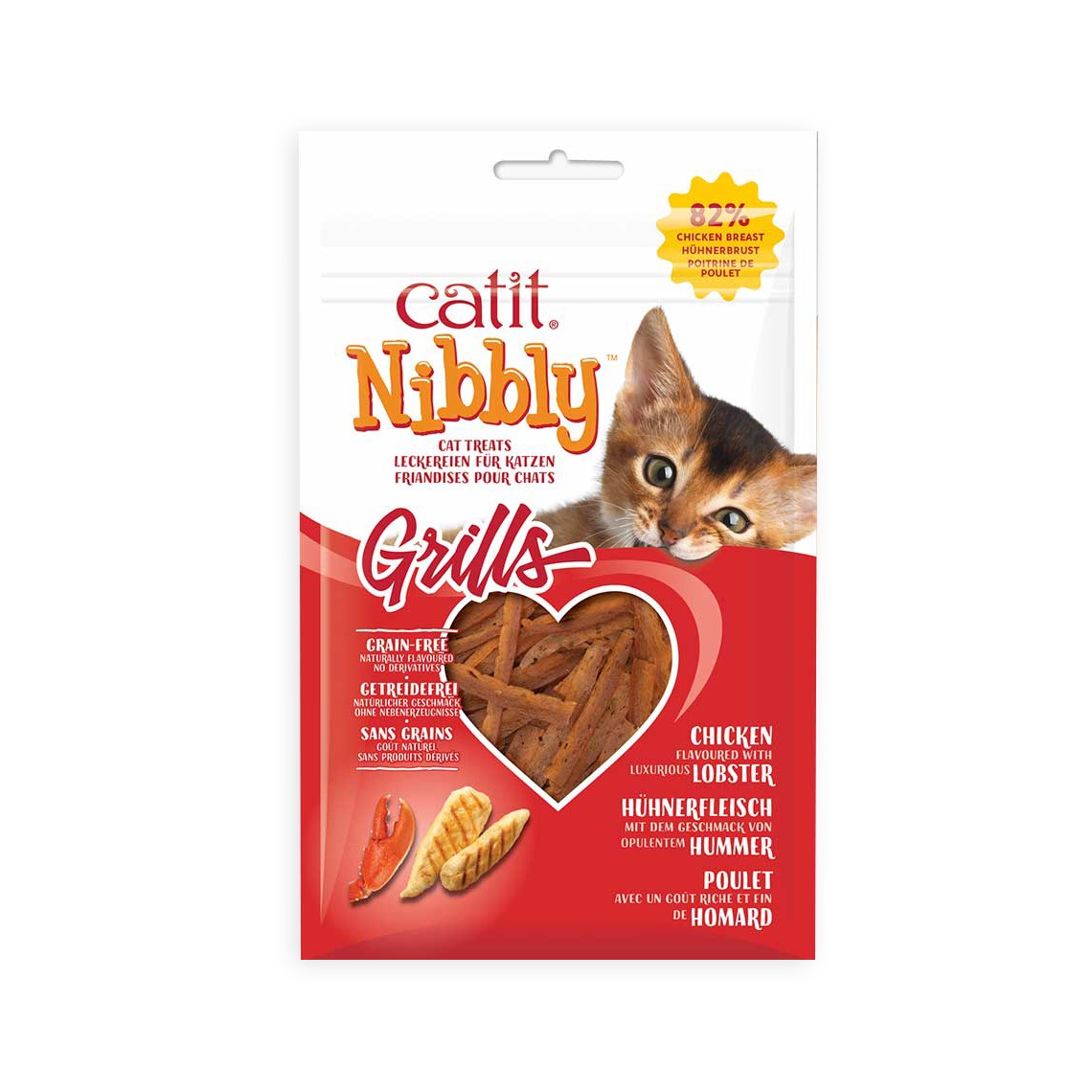 Les friandises Nibbly Grills pour chat sont de délicieuses tranches de poulet grillées, aromatisées aux fruits de mer.