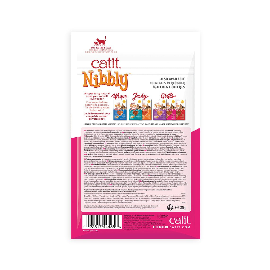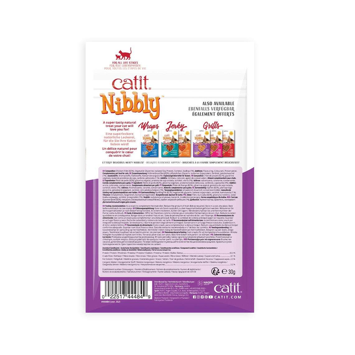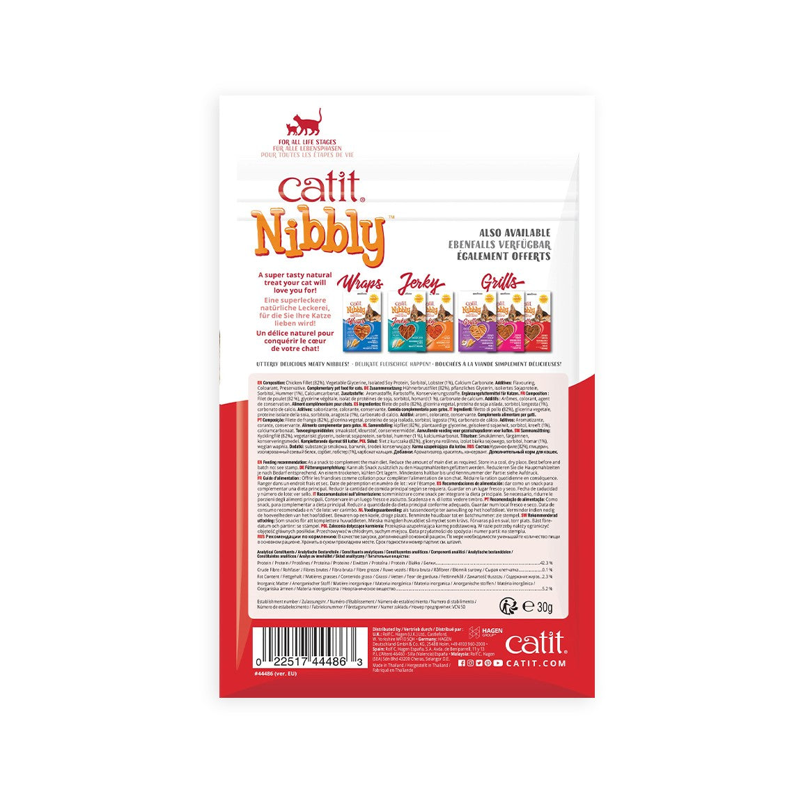 Les friandises Nibbly Grills pour chat sont de délicieuses tranches de poulet grillées, aromatisées aux fruits de mer.