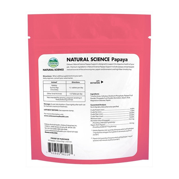 Les cachets « Natural Science Papaya Support » assure un apport naturel en papaïne et en bromélineassocié à du foin de grande fibre Timoty. Ces enzymes participent à la prévention des boules de poils dans l’estomac. Si la meilleure prévention des trichobézoards (nom scientifique des boules de poils) passe par une alimentation riche en fibres, constituée en majorité de foin de très bonne qualité, ces enzymes pourraient également jouer un rôle de prévention. Les cachets à la papaye Oxbow sont produits à partir des meilleurs ananas et papayes.