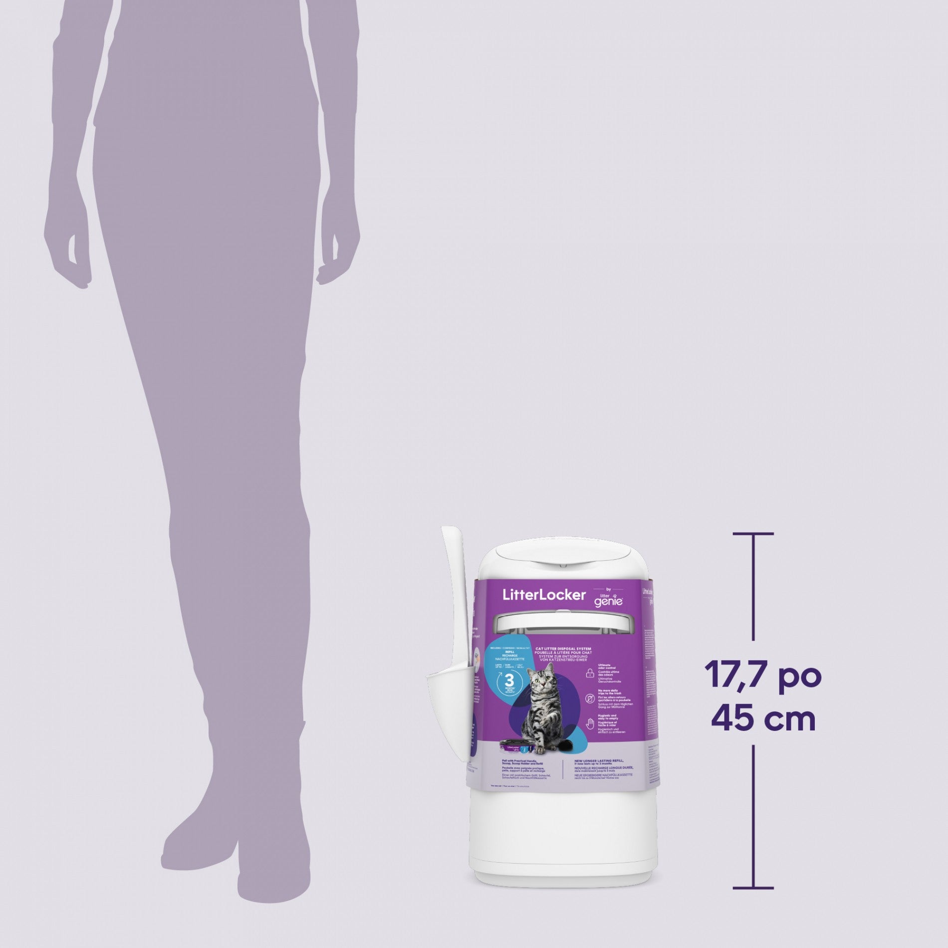 La poubelle Litter Locker by Litter Genie peut contenir jusqu'à 2 semaines de litière souillée et chaque recharge dure environ 12 semaines pour un chat.