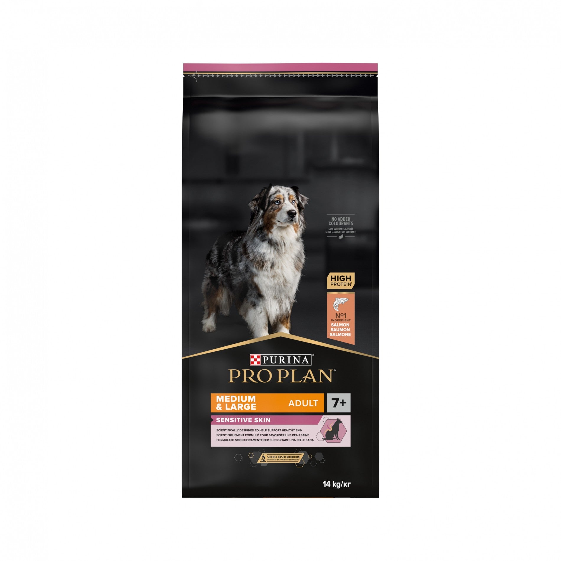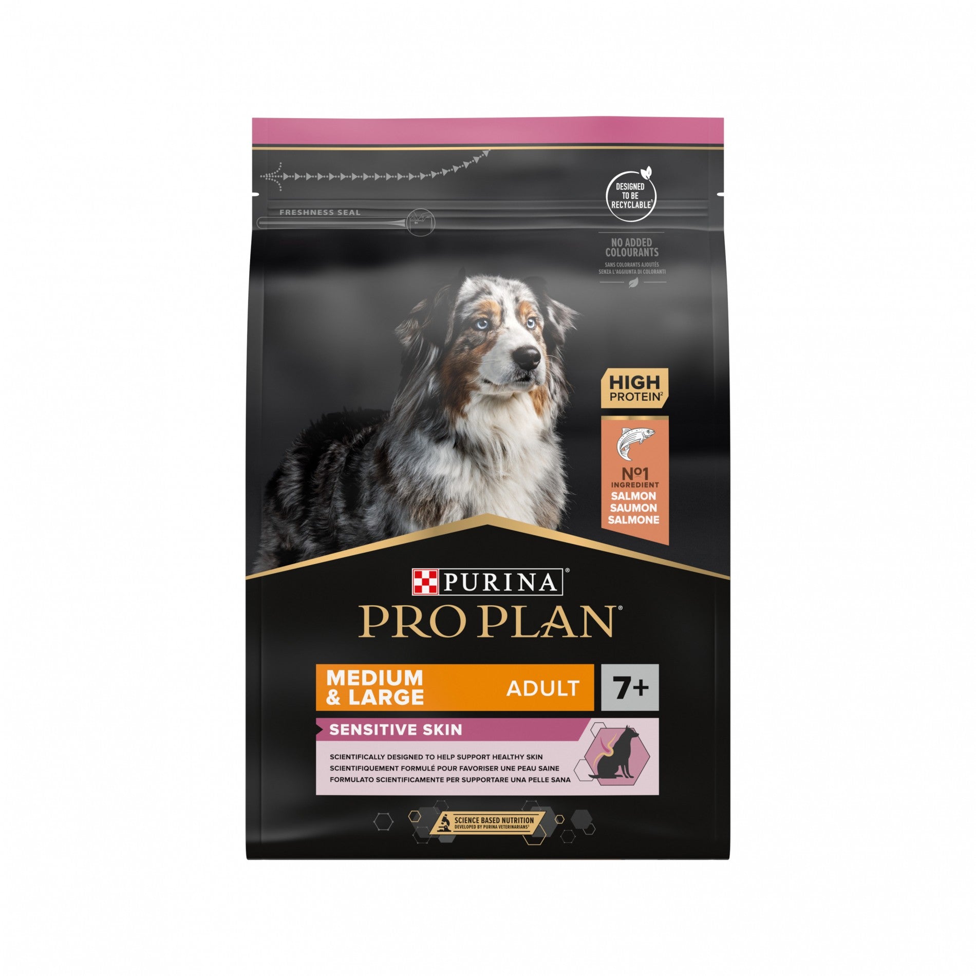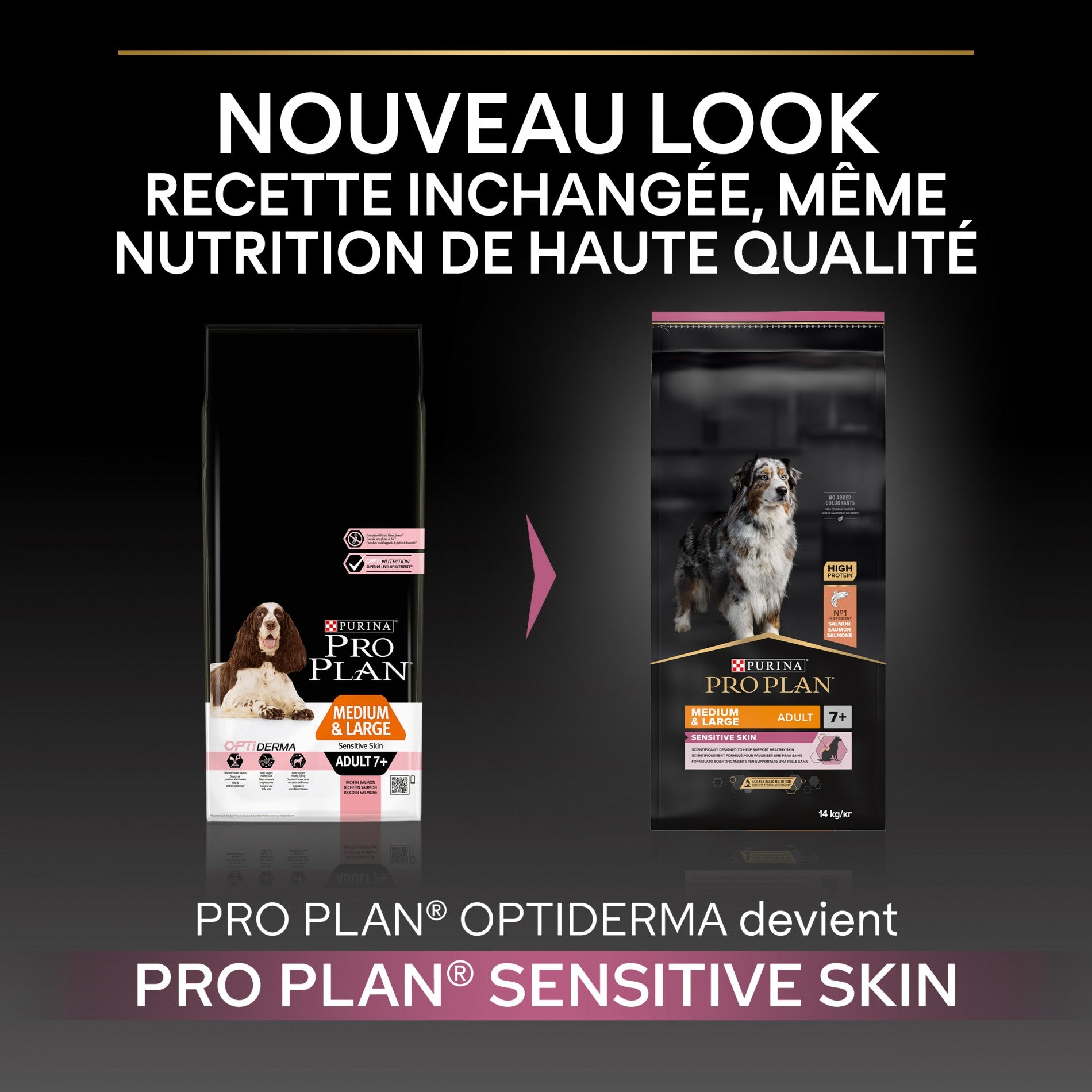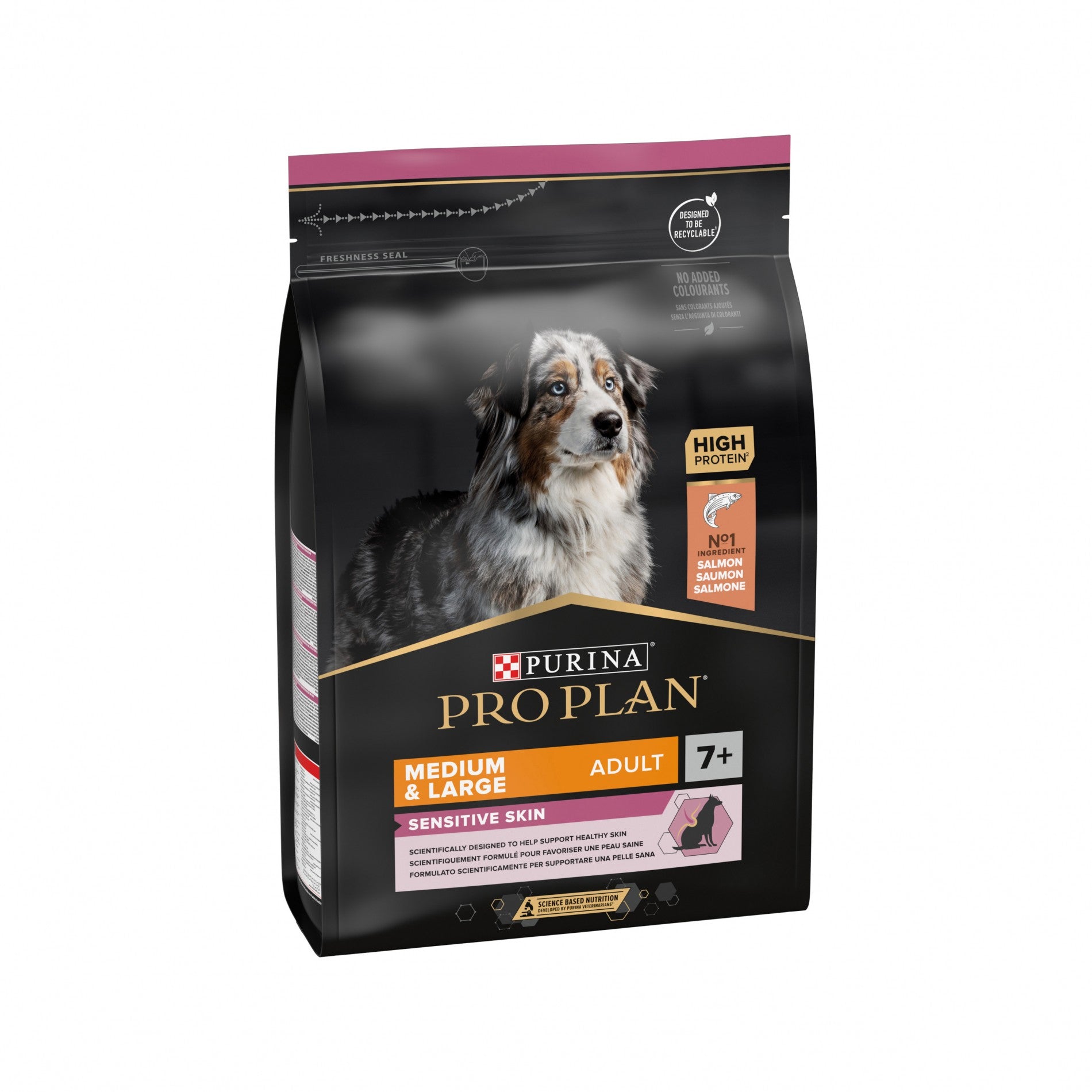 L'aliment PRO PLAN Sensitive Skin Medium & Large Adult est conçu spécialement pour les chiens de plus de 10 kg de plus de 7 ans qui présentent une sensibilité cutanée. Il apporte tous les nutriments nécessaires pour vivre leurs années seniors en pleine santé et assure un confort de la peau.