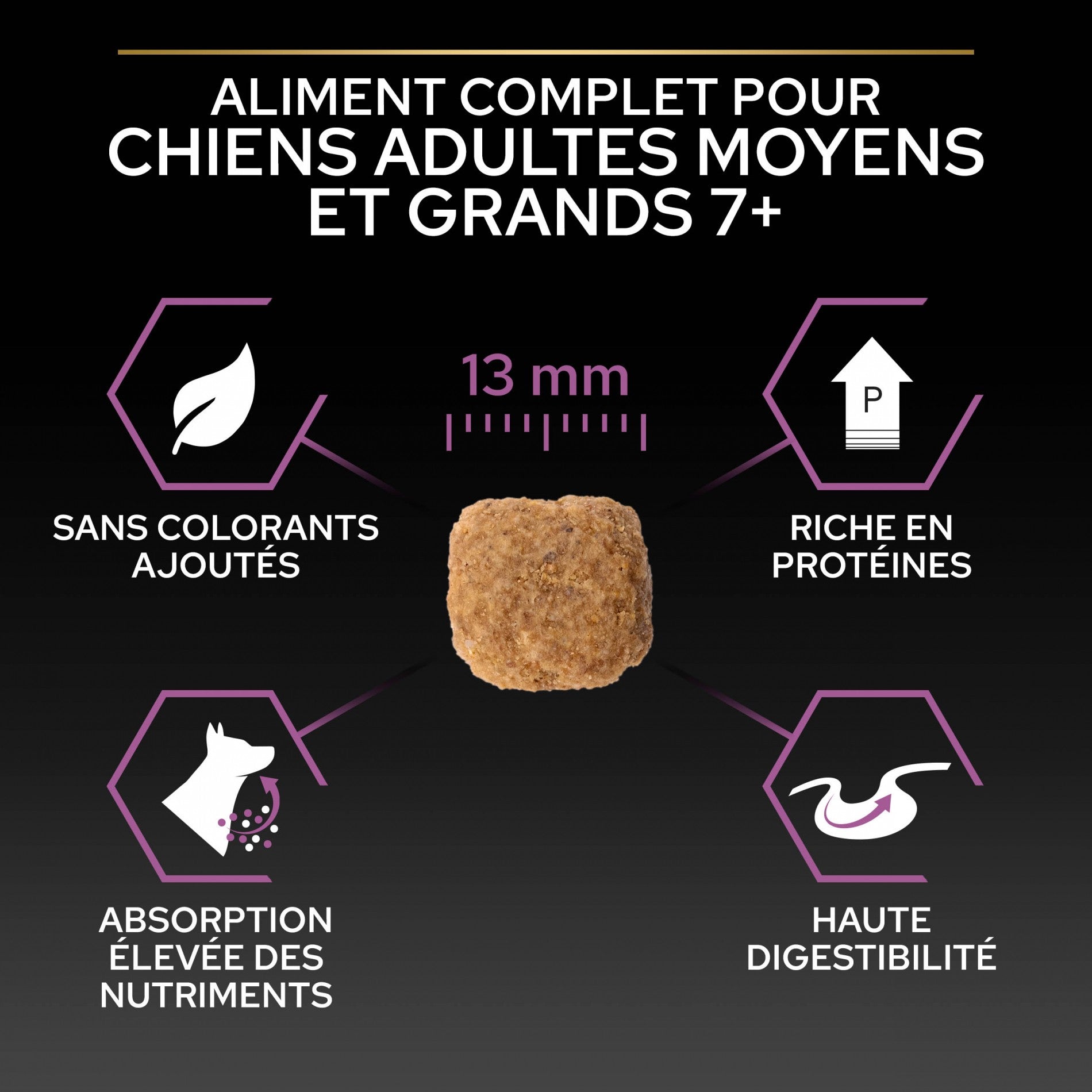 - Soutient la bonne santé des chiens vieillissants grâce à une nutrition adaptée