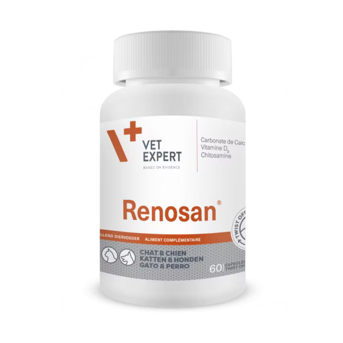 Le complément alimentaire Rénosan de Vetexpert soutient le fonctionnement des reins lors d'insuffisance rénale chez le chien et le chat.