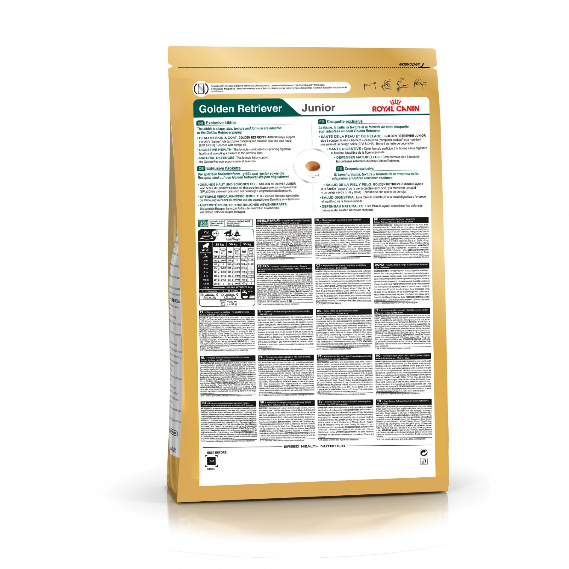 ROYAL CANIN® Golden Retriever Puppy est une alimentation complète et équilibrée spécialement formulée pour accompagner la croissance des chiots Golden Retriever âgés de 2 à 15 mois. Ces croquettes favorisent une croissance harmonieuse et un développement optimal.