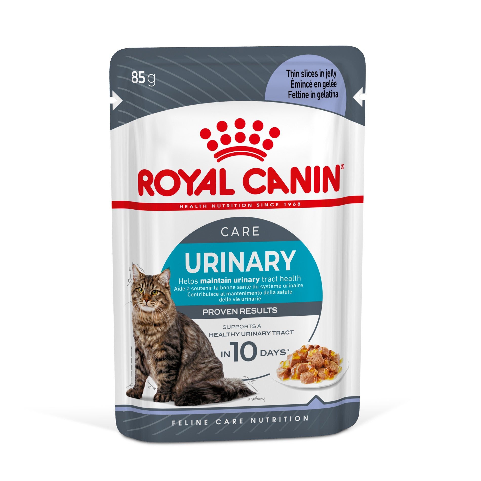 ROYAL CANIN Urinary Care en Gelée est un aliment complet sous forme de pâtée en gelée, conçu pour aider à maintenir la santé urinaire des chats adultes de 1 à 7 ans. Il peut également être donné occasionnellement aux chats seniors (7 à 12 ans).