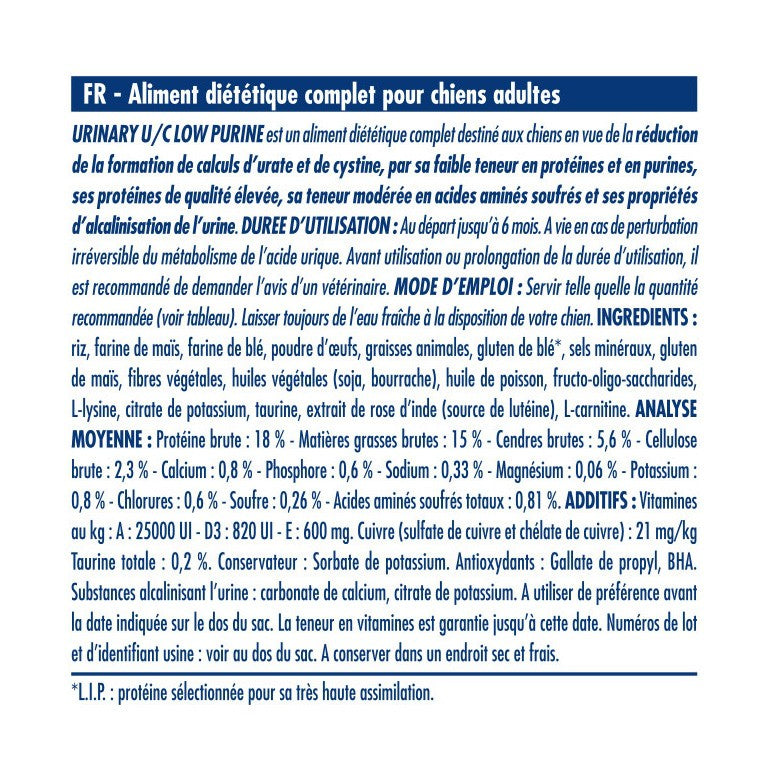 L'aliment Royal Canin Urinary U/C Low Purine est contre-indiqué en cas de gestation, lactation, croissance et aussi lors de l'utilisation de médicaments acidifiant l'urine.