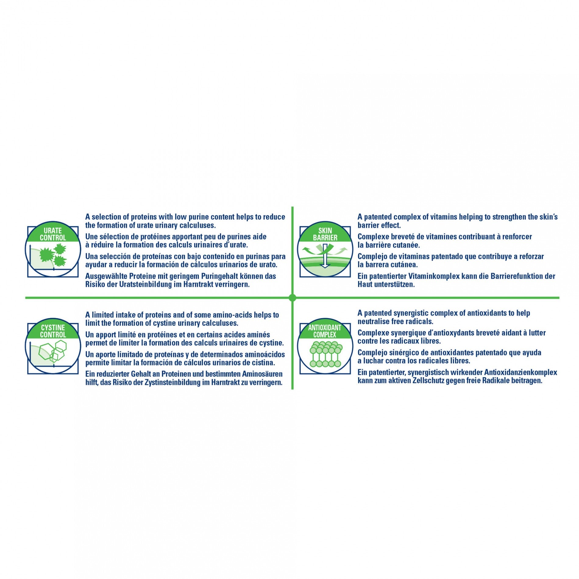 - Pour l'alimentation de maintenance des chiens de races à risque élevé de calculs métaboliques (notamment les Dalmatiens)