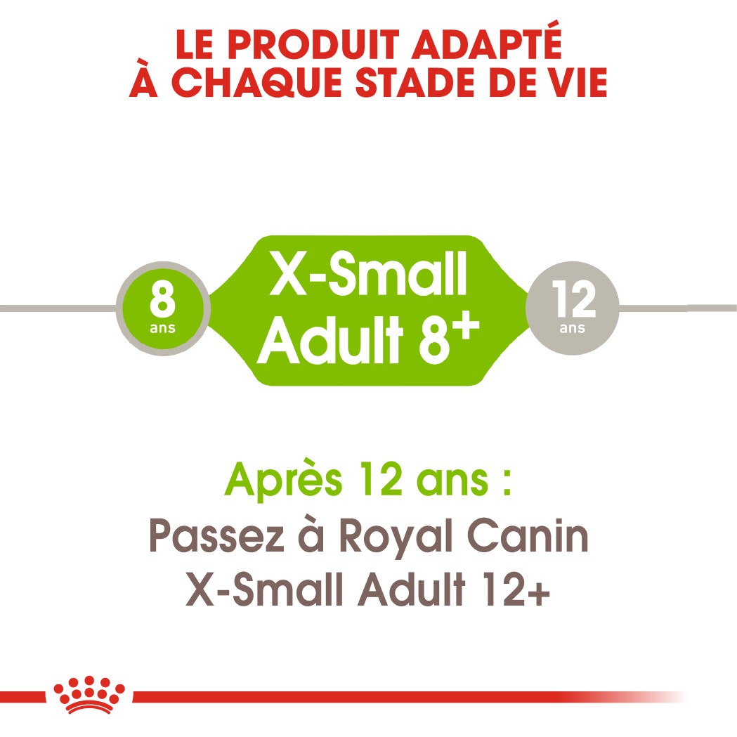 Les croquettes ROYAL CANIN® X-Small Adult 8+ sont spécialement conçues pour répondre aux besoins nutritionnels de votre chien adulte de très petite taille, âgé entre 8 et 12 ans et pesant jusqu'à 4 kg.