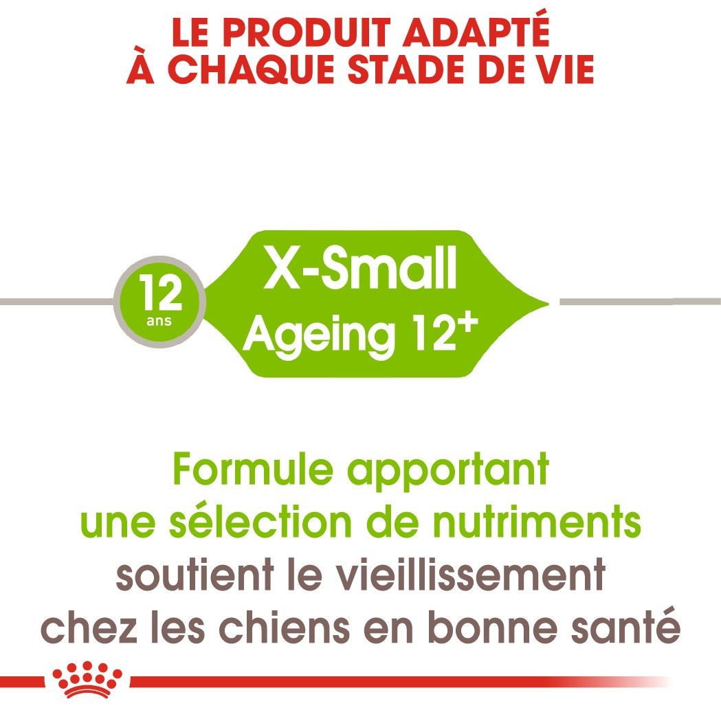 Les croquettes ROYAL CANIN® X-Small Adult 12+ sont spécialement conçues pour répondre aux besoins nutritionnels de votre chien adulte de très petite taille, de plus de 12 ans et pesant jusqu'à 4 kg.