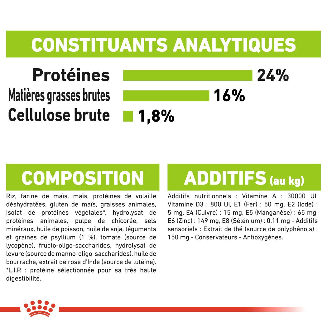 - favoriser un transit sain et une bonne santé digestive grâce aux protéines à haute digestibilité et à l'apport adapté en fibres