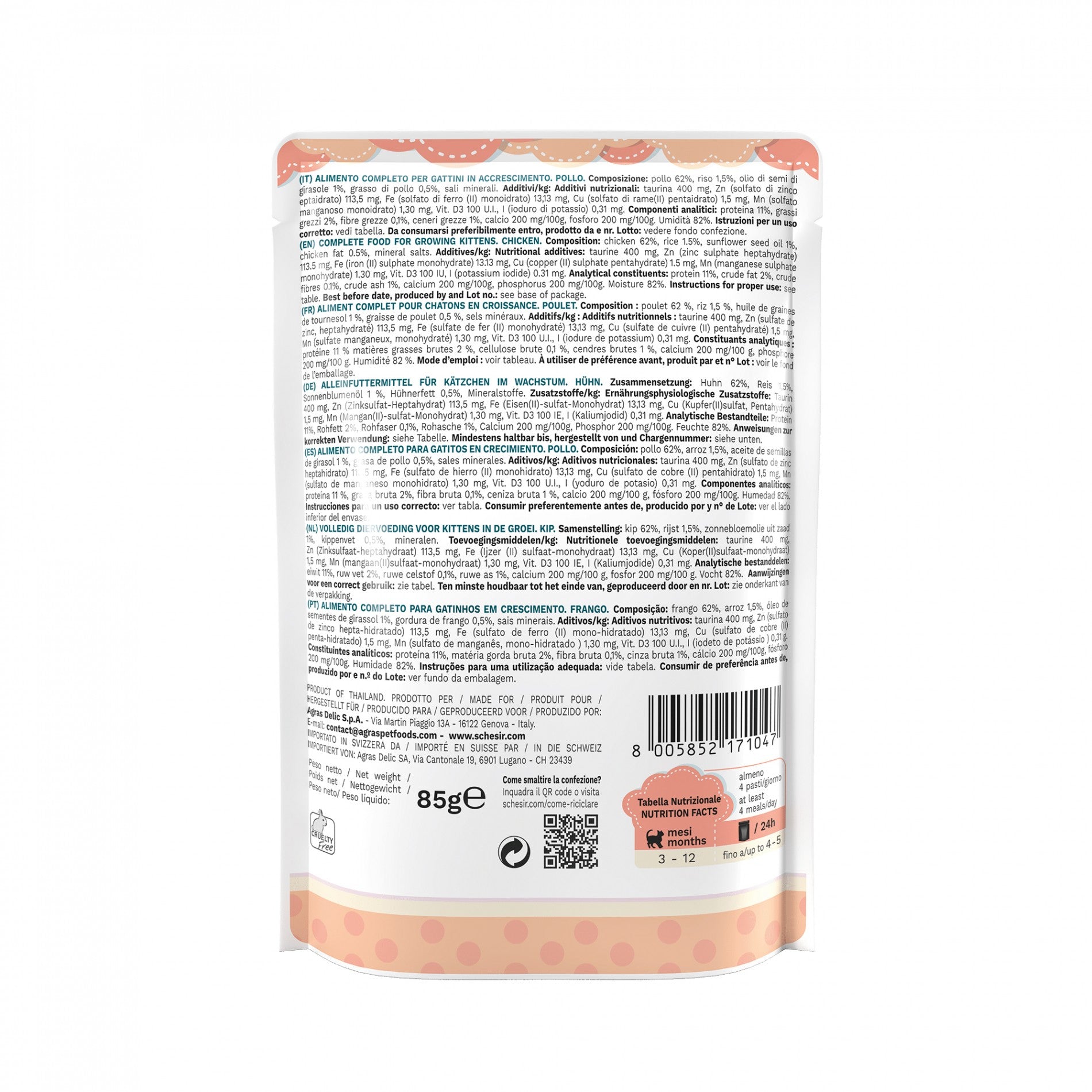 Les sachets Pâtée en gelée Kitten Schesir sont adaptés aux besoins des chatons. Ils existent en deux saveurs (thon et filets de poulet) très appétentes et appréciées des chatons.