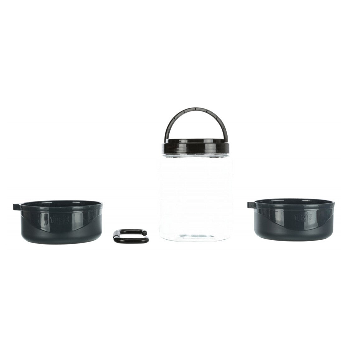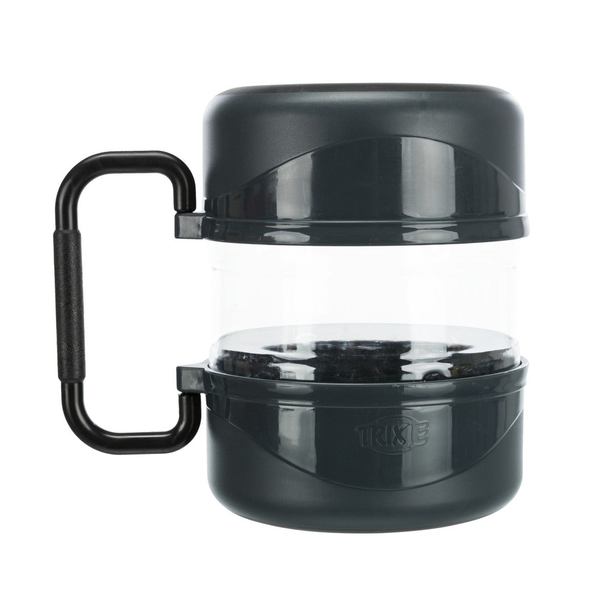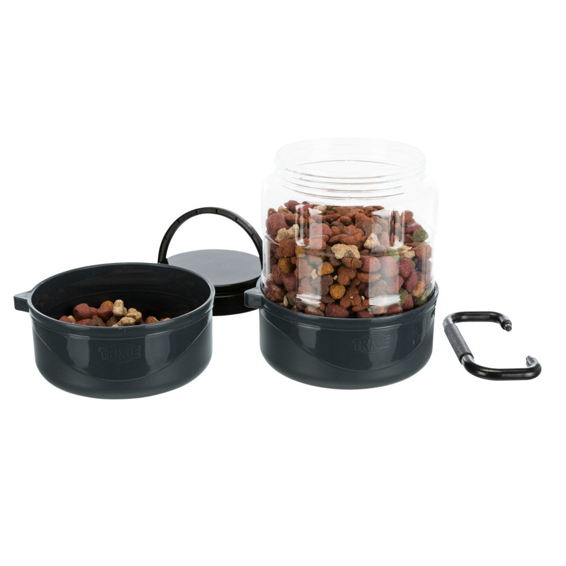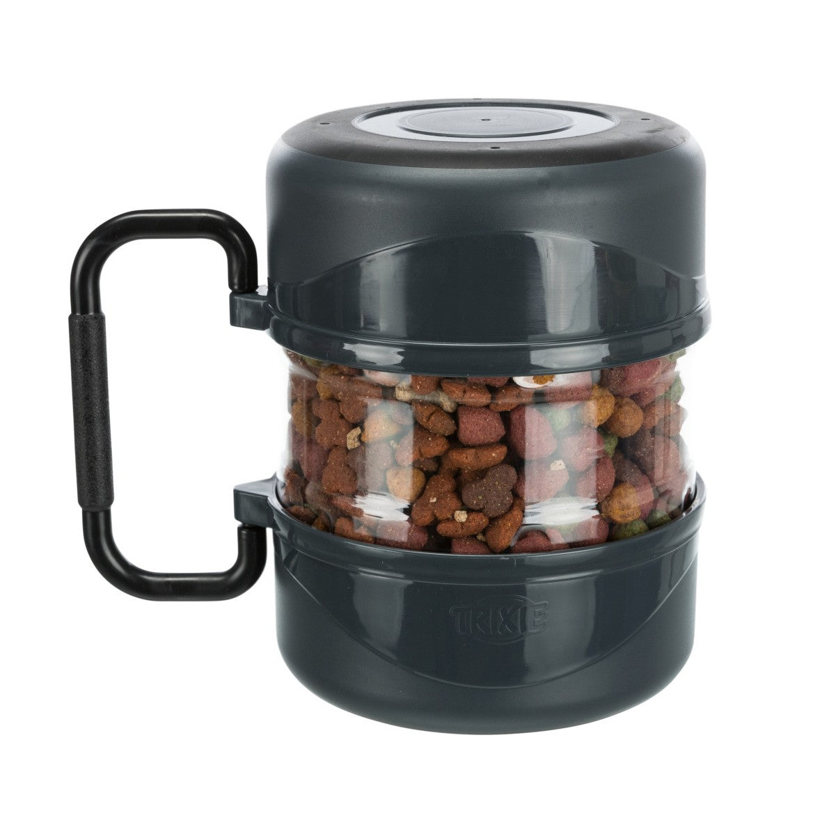 En plastique rigide, ce set de voyage pour chien et chat se compose d'une boîte cylindrique pouvant contenir environ 500 grammes de croquettes et de deux écuelles qui s'adaptent parfaitement à la boîte. Ce set pour chien et chat mesure en tout 18 cm de hauteur sur 13 cm de diamètre, ce qui le rend bien pratique lors de promenades, sur la plage, lors de longs trajets en voiture et même lors de courts séjours.