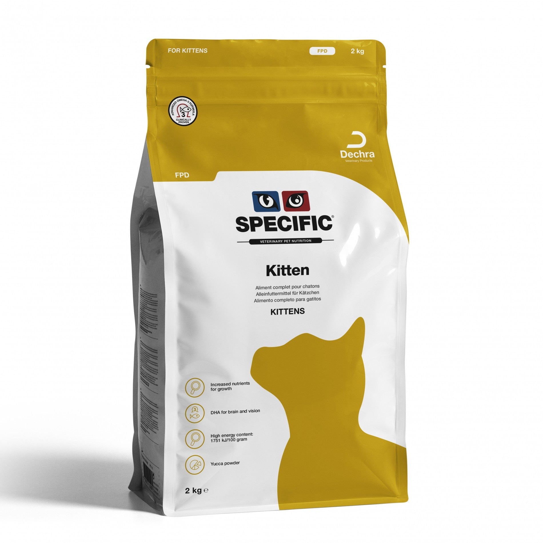 Les croquettes SPECIFIC Kitten FPD sont particulièrement adaptées aux chatons en croissance pendant la période qui s'étend du sevrage jusqu'à l'âge de 8-12 mois (selon la race ou une éventuelle stérilisation).
