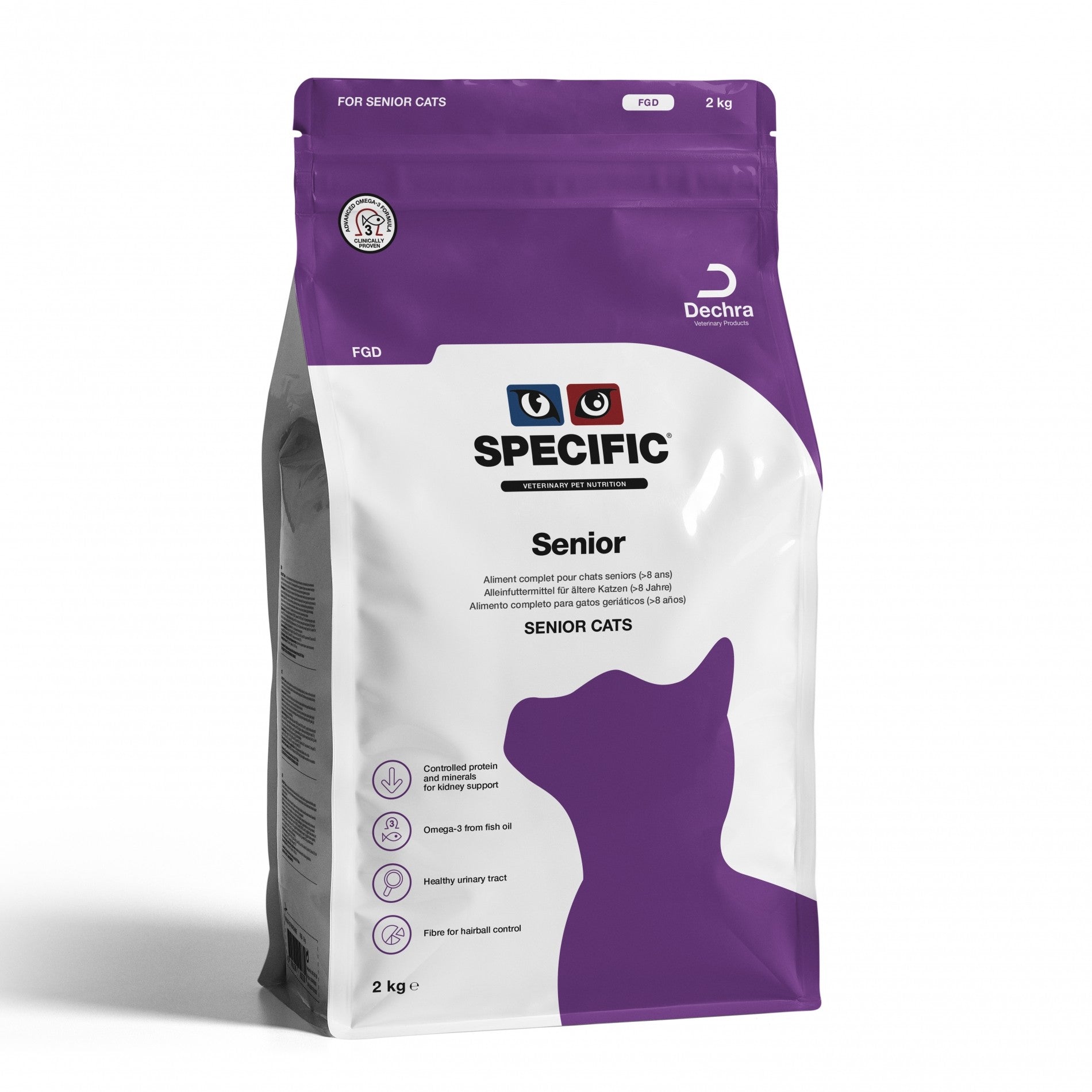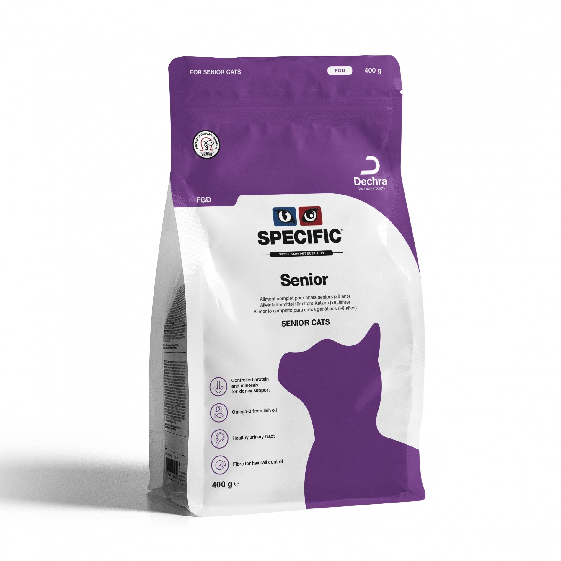 Les croquettes SPECIFIC Senior FGD sont particulièrement adaptées aux chats âgés, dès l'âge de 8 ans. Elles prennent en compte le fait que les besoins du chat changent avec l'âge.