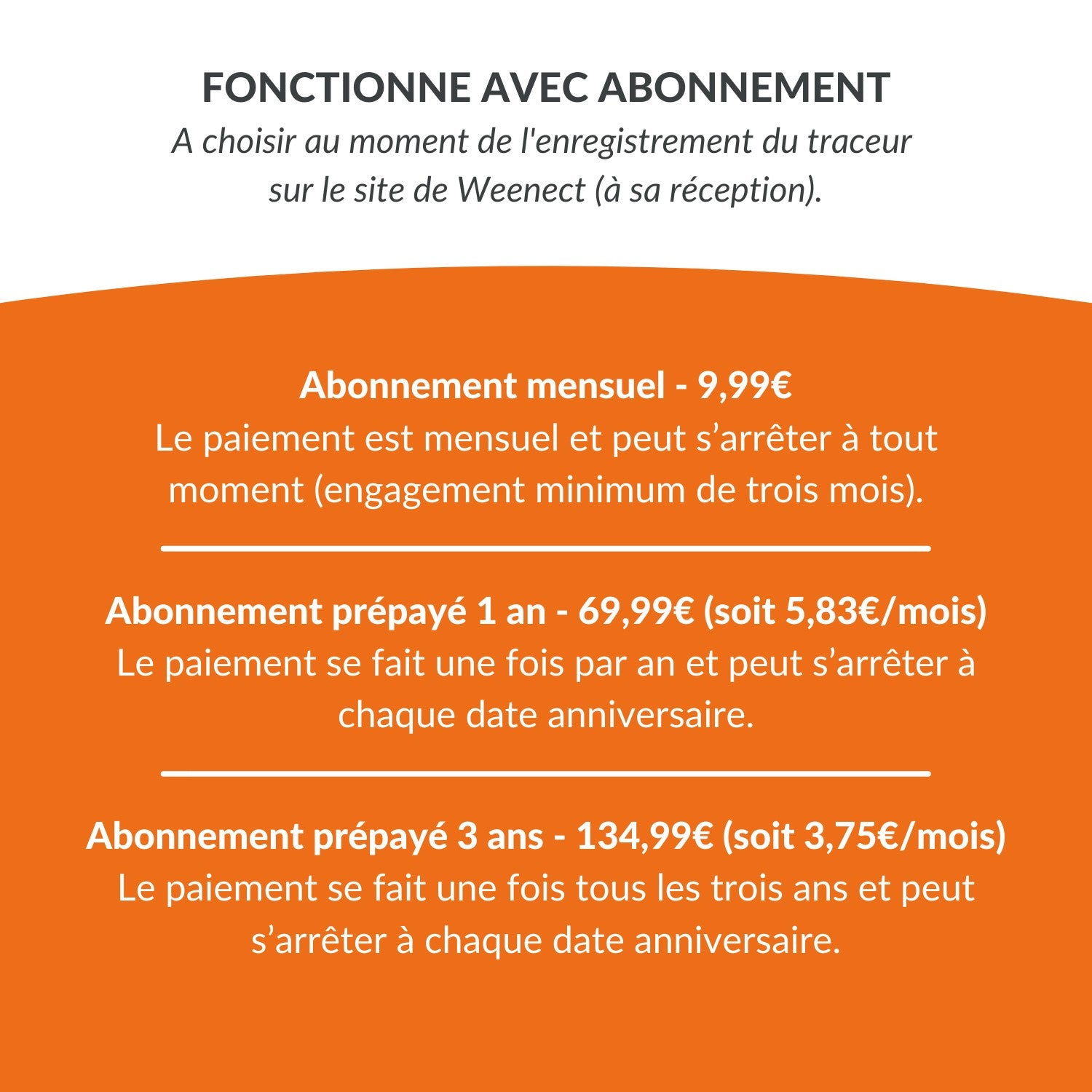 Le traceur GPS est équipé d'une carte SIM (fournie) et nécessite un abonnement pour couvrir les frais de service :