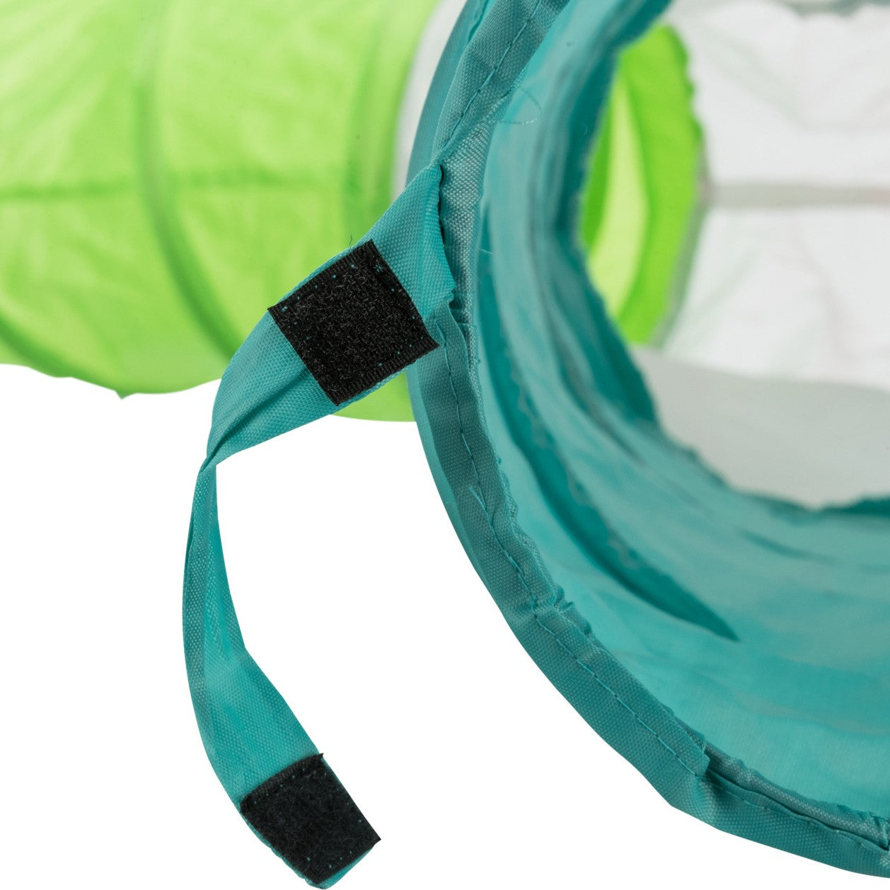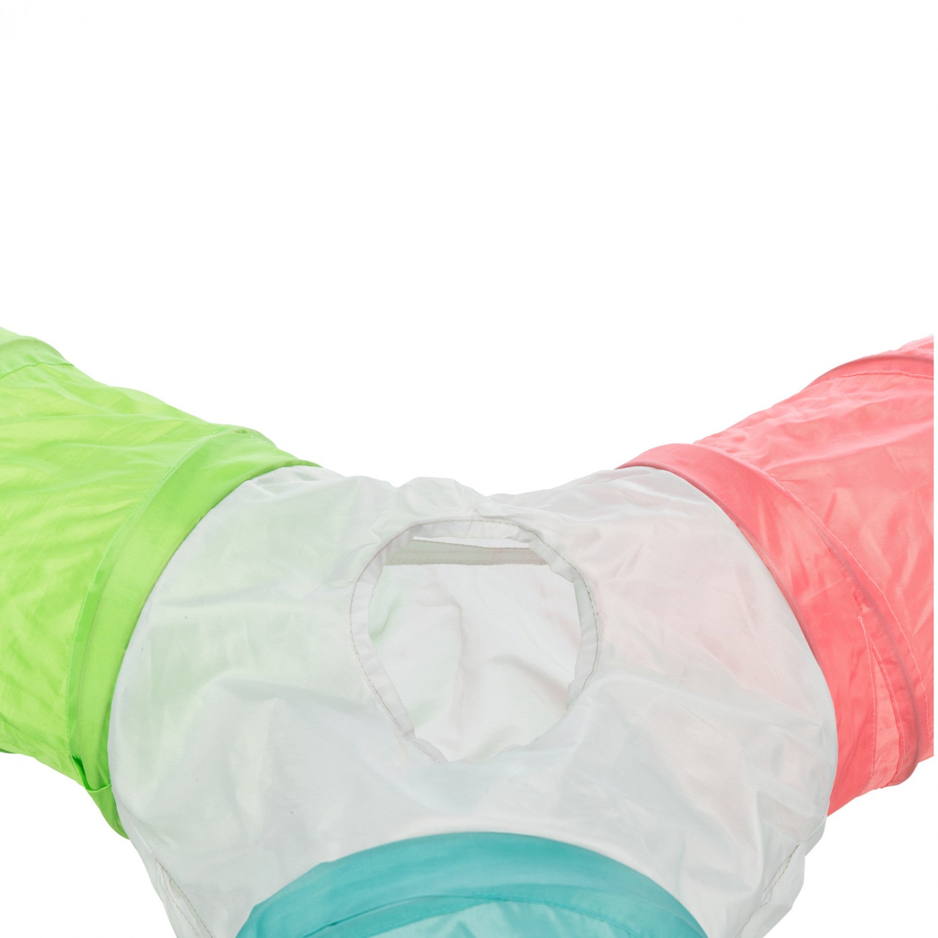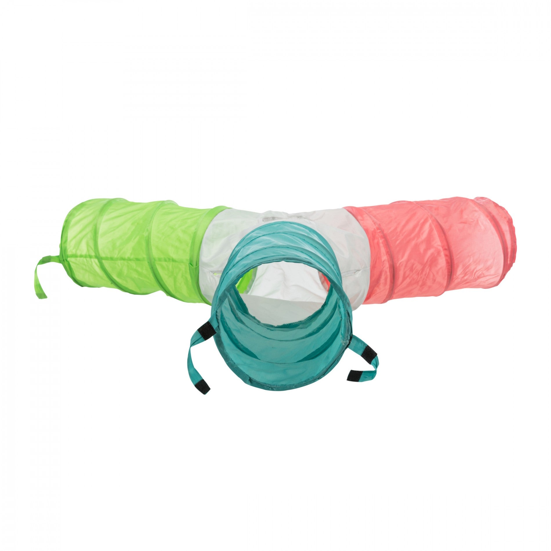 En nylon de haute qualité, vous pourrez placer ce tunnel de jeu pour rongeur, lapin et furet aussi bien en intérieur qu'en extérieur. Votre petit animal de compagnie pourra alors jouer, guetter, se cacher à l'une des 4 entrées de ce tunnel de jeu en forme de "Y".