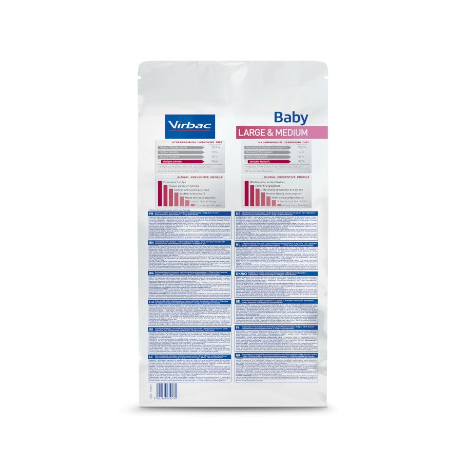 Les croquettes Virbac VETERINARY HPM Baby Medium & Large sont spécialement conçues pour les chiens de moyenne race (11 à 25 kg) jusqu’à 6 mois et pour les chiens de grande race (>25kg) jusqu’à 7 mois.