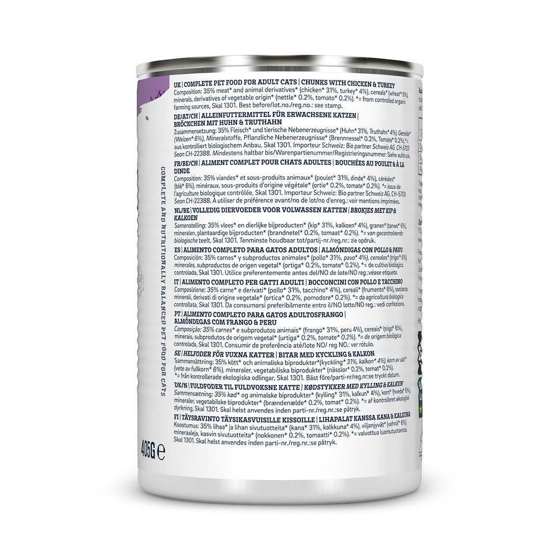 Un repas biologique, savoureux, et sain pour votre chat, disponible en plusieurs saveurs, en boîte de 405 g.